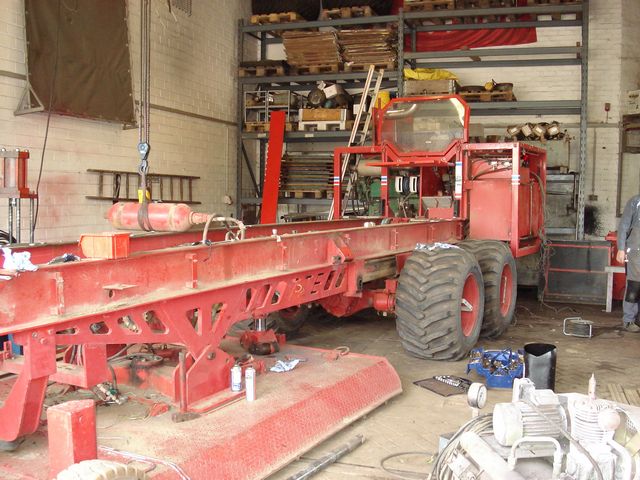gab es die ersten vagen Überlegungen zu einem Neubau eines Bremswagens. Da die „Oma“ nicht mehr in den besten Jahren war und auch schon einiges durchgestanden hatte, wurde es langsam Zeit sich was neues zu beschaffen. Auch gelang man mit der Bremskraft der Oma so langsam an die Grenzen. Schließlich legten die Tractoren jedes Jahr noch eine Schüppe voll PS obendrauf. Die Erfahrungen mit den Bremswagen für Trecker Trecks, der „Oma“ und dem „Red Shadow“ hatte man nun ja auch schon gesammelt. Dieses Wissen sollte jetzt mit in den Neubau einfließen. Ein paar Vereinsmitglieder waren auch schon zu Besuch in den USA gewesen und dabei wurden die dort eingesetzten Bremswagen genau unter die Lupe genommen. Als sich alle einig waren wurde dann aus dem Team Jäger und Sammler. Insbesondere der Wunsch nach einer Tandemachse ohne Außenplaneten gestalltete sich anfangs schwierig bei der Suche. Laufen diese Achsen doch sehr leicht los, ideal also für einen Bremswagen. Wie so oft wird man dann in solchen Fällen eher bei unseren niederländischen Nachbarn auf einem riesen Schrottplatz fündig. Abseits einer ca. 3 Meter hohen und 20 Meter langen „Wand“ aus zig verschiedenen Achsen und Achsteilen wurde doch noch eine Scania Achse, die exakt den Vorstellungen entsprach, gefunden. In der „Achswand“ wurde dann auch noch eine Rockwell Achse für den Backantrieb gefunden. Aus einem 10 Meter breiten und 5 Meter hohen „Getriebehaufen“ kam zudem noch ein passendes Fullergetriebe und ein Allradgetriebe dazu, was beides für den Back- und Fahrantrieb benötigt wurde. Unglaublich zu lesen, aber so war es. Länger und schwieriger war da die Suche nach den gewünschten Motor für den Antrieb des Bremswagens. Ein lufgekühlter Deutz 6-Zylinder sollte es werden, ideal für den wenigen und engen Einbauplatz. Konnte man sich doch so die Wasserkühlung sparen da die Deutz Motoren ja luftgekühlt sind. Nach mehreren Misserfolgen erfuhren wir von einem fast ausgeschlachteten Mengele Häcksler wo das begehrte Herz noch verbaut war. Kurze Verhandlung, Schraubenschlüssel unter den Arm geklemmt und zwei Wochen später stand der Motor in der TTE Werkstatt. Noch auf dem Pkw Anhänger stehend, mit einer umgedrehten Raddkappe als Tank (was anderes war vor Nervosität nicht schneller greifbar) und einem Überbrückungskabel von einem Lkw wurde der Deutz zum Leben erweckt. Erster Probelauf, dass Gerät läuft, auf Schlag!!!!