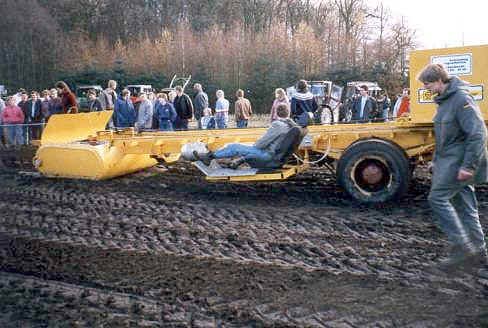 war es dann so weit. Der Deutz von Bernd Marken trat gegen den den FIAT Agri von Enno Claußen an. Austragungsort war eine Wiese in der Straße „Im Vieh“ in Edewecht. Die Wette hatte sich natürlich in Windeseile im Dorf herumgesprochen und so fanden sich an diesem kalten Aprilsonntag ungefähr 50 Leute ein um das Spektakel zu verfolgen. Da es keinen Bremswagen gab um die Kraft der Traktoren zu messen hatte man sich etwas Besonderes einfallen lassen. Not macht erfinderisch und das war in Edewecht schon immer ein besonderes Talent. Auf einem Tieflader stand ein Trecker, der Luft zum bremsen erzeugte. Nach einer gezogenen Strecke von 10 Metern wurde der Schlauch für die Luftdruckbremse zwischen Trecker und Tieflader von Hand getrennt. Der jetzt fehlende Luftdruck leitete den Bremsvorgang des Tiefladers ein. Nun galt es für die Teilnehmer den bremsenden Tieflader möglichst weit zu ziehen. Am Schluß hieß der Sieger Werner Kruse aus Portsloge mit seinem MF. Die Wette zwischen Bernd und Enno entschied aber Enno ganz klar für sich. Am Ende des Tages traf man sich dann in einer Edewechter Gaststätte. Hier wurde bei einer ausgelassenden Siegesfeier viel gefachsimpelt. Einer hatte da auch schon etwas über Trecker Treck oder Tractor Pulling gehört. Schnell wurde man sich einig den Wettbewerb zu wiederholen. An diesem Abend entstand auch die Idde einen Bremswagen zu bauen um allen Teilnehmern gleiche Wettbewerbschancen zu ermöglichen.