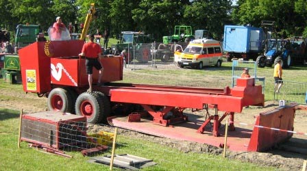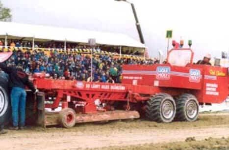 suchte man ein neues Gelände, ging es doch am Espergöhlen sehr eng zu. Es erfolgte dann der Umzug auf das Gelände rund um den Bauernhof Willms am Göhlenweg. Noch heute finden dort die Läufe zur Deutschen Meisterschaft im Tractor Pulling statt. Bevor die Trecker seinerzeit an den Start durften wurden sie vorher bei der Raiffeisenwaren-Genossenschaft in Süd-Edewecht gewogen und in vier Gewchtsklassen eingeteilt. Anschließend rollte man im Konvoi zum Veranstaltungsgelände. Manch einer, der von dem Wettkampfziehen nichts mitbekommen hatte, sah darin eine nicht angemeldete Demonstration von Landwirten. Ca. 40 Trecker bis zur 7 Tonnen Klasse nahmen an diesem Tag teil. Es stellte sich bald heraus das der Bremswagen sich schon ziemlich am Limit bewegte. Neue Ideen waren auch schon gefunden und schöner sollte er auch werden. Also entstand schon nach kurzer Zeit Bremswagen Nummer 2 für Standardtraktoren in Edewecht.