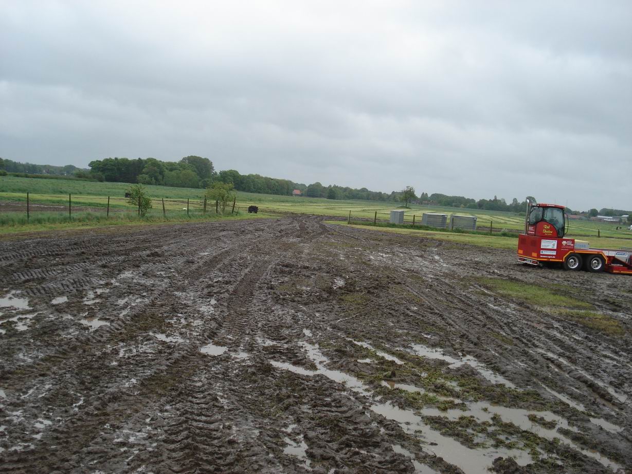 Dann kam ein weiterer Tiefschlag und zwar einer der sich gewaschen hatte und dem Verein an den Rand des Ruins brachte. Für die Heimatveranstaltung hatte man sich entschieden den Termin in den Mai zu verlegen. Mann erhoffte sich dadurch wieder mehr Zuschauer. Waren doch zuletzt am dem Augustwochenende zig andere Veranstatlungen im Edewechter Umland dazu gekommen. Man dachte sich im Mai sind keine Ferien, es gibt keine brüllende Hitze und die Leute wachen auch gerade erst aus dem Winterschlaf und sind dadurch Unternehmenslustiger. Ein wenig Regen wurde mit einkalkuliert, war einem schon klar das der Mai gewisse Riskiken birgt. Er hat aber auch durchaus schöne Seiten. Und außerdem war man ja erfahren. Regen kannte man aus dem August auch zu genüge. Soviel Regen wie dann allerdings folgte kannte man definitiv nicht. Voller Tatendrang begann man mit dem Aufbau. Dieser musste bereits ständig unterbrochen werden da es immer wieder regenete und das nicht zu knapp. Bis Freitagabend war das Gelände auch noch relativ gut in Schuss. Dann folgte allerdings in der Nacht Regen ohne Ende. Samstag morgen war klar, das wird hart, ganz hart. Aber der Himmel sah noch ziemlich gut aus und man begann mit dem Trecker Treck für Jedermann. Am Samstagmittag öffnete der Himmel dann buchstäblich seine Schleusen und es hörte nicht mehr auf zu regnen. Das Gelände war kurze Zeit später komplett abgesoffen. Man stand bis zum Knöchel im Wasser. Kurz nach Mittag wurde zusammen mit der DTTO der erste „Rain Out“ für Edewecht beschlossen. So oft war man schon daran vorbei geschrammt, jetzt ging es wirklich nicht mehr. Ein herber Schlag, auch in finanzieller Hinsicht für den Verein.