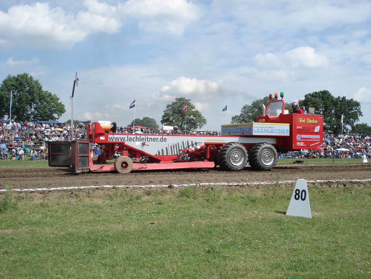 Füchtorf war da, ehe man sich versieht ist die Winterpause vorbei. Trotz eines echten Kraftaktes in den letzten 4 Wochen gelang es nicht den neuen Bremswagen pünktlich zum Saisonstart fertig zu bekommen. Tag und Nacht wurde geschraubt, selbst Urlaub wurde genommen. Aber zum Schluss rennt einem einfach die Zeit davon. Das gute und alte, bewährte Material wurde verladen und man machte sich auf den Weg nach Füchtorf. Beim Testlauf am Freitagabend zeigten sich dann die ersten Fehler. Bis zum Schluss hatte man alles versucht. Aber mit Fehlern in Elektrik, Mechanik und Hydraulik ist das Risiko zu hoch diese noch abgestellt zu bekommen auf der Veranstaltung. Da die Saison jetzt eh gestartet war beschloss man auch in Ruhe weiter zu machen und im Laufe der Saison den neuen auf die Bahn zu bringen. Je mehr Druck man sich machte, desto mehr Fehler konnten sich auch einschleichen. Also lieber einen Gang runter schalten. Im Juli war es dann endlich soweit. Nach ca. 3500 Arbeitsstunden und etlichen Schweißtropfen war es geschafft. Der Red Shadow TE (Third Edition) griff erstmals in Grimmen in das Wettkampfgeschehen ein. Seine Feuertaufe bestand er mit Bravour. Ohne Probleme wurde die Veranstaltung über die Bühne gebracht. Die TÜV-Abnahme als Sattelauflieger wurde kurz vorher auch bestanden, der Tieflader war also in Zukunft überflüssig.