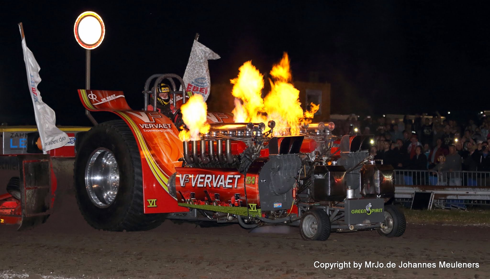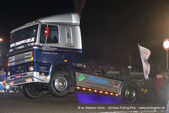 Die Super Sport Trucks waren auch wieder mit dabei. Immer mehr Frauenpower also in Edewecht. Die junge Carola de Heus mit ihrem DAF und mit mittlerweile über 2000 PS. Ihre 19 jährige Schwester Janneke hatte dann noch ihren Scania V8 Hauber mit im Gepäck. Die männlichen aber auch weiblichen Fans waren völlig aus dem Häuschen. Geschlagen geben musste sich die Mädels dann aber von Arjan Appeldoorn und seinen weit über 2500 PS starken Volvo FH 16. Selbst im Stechen hämmerte er bis weit hinter die Full Pull Marke. Nur der Erdwall war ihm hier noch im Weg. In der letzten Klasse des Tages wurde Geschichte geschrieben und das beste daran, eine Deutsche! Die 2,5 Tonnen Klasse, viel PS, wenig Gewicht und schwierig zu fahrende Bahn. Hier zeigte sich sehr schnell ab das die Bahn durch die Hitze stark gelitten hatte. Es eine Kunst die leichten und sehr starken Tractoren zu beherschen, was sich als recht schwierig raus stellte. Wilde Ritte der Tractoren die knapp vor der 100 Meter Marke endeteten. Und dann kam einer an den Start gehoppelt, das Mitas Green Monster aus Deutschland. Der Gashebel ging auf Vollgas und das Monster flog förmlich über die Bahn und schleuderte Richtung Erdwall. 130 Meter ganz locker, kein Problem. Die anderen Teams guckten nicht schlecht. Alle nahmen ihren 2. Verusch war, aber keiner schafte es auch nur annähernd an diese Weite, geschweige denn einen Full Pull zu fahren. Das Team wie auch die Fans feierten diesen Sieg bis es wieder hell wurde.