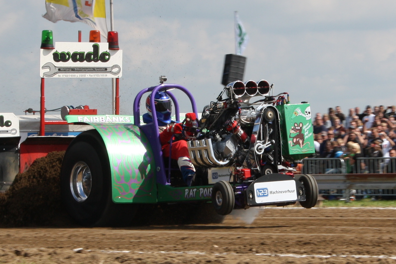 bestätigte dann auch den Erfolg der Umbauarbeiten. Die größeren Reifen gaben nochmals eine Verbesserung. Nachdem dreiviertel der Saison rum war hatte man so jeden Bahntyp wie auch Wetterlage hinter sich. Langsam wurde jetzt realisiert das sich jeder Schweisstropfen und jede Minute in der Werkstatt gelohnt hatte. War es doch viel Arbeit und das ganze in nur 5 Monaten in der Freizeit. Veranstalter wie auch Fahrer bestätigten das und man endlich da wo man schon seit der Jungefernfahrt sein wollte. Manche Dinge brauchen halt etwas Zeit. Und auf der eigenen Veranstaltung war das Jahr der Herausforderungen. Zum 27. mal ließ man die Erde beben. Jetzt musste man sich anderen Herausforderungen stellen. Es war heiß, sehr heiß sogar. Das Thermometer zeigte jenseits der 30 Grad an, dazu noch ein schön lauer Wind. Die Luft über der Bahn war am flimmern. Das sind die schlimmsten Voraussetzungen die man für eine Tractor Pulling Bahn haben kann. Den ganzen Tag schon war man damit beschäftigt irgendwie die Feuchtigkeit in der Bahn zu halten. Die Top Elite der 2,5 Tonnen Klasse aus ganz Europa stand im Fahrerlager bereit. Aus den Niederlanden der „de Jong Special“, „Asterix“ und die 16 jährige Kyra Kustermanns mit ihrem „Hot Art“, „Mad Max“ aus Belgien oder erstmals ein Engländer oder besser Engländerin. Ellie Pacey mit ihrem „On the Limit“. Namen die unter Kennern aufhorchen lassen.