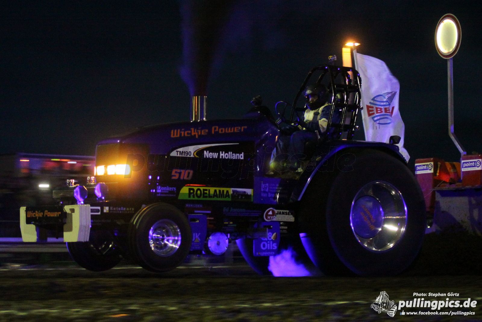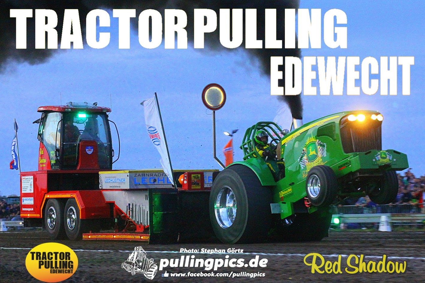 Die eigene Veranstaltung Stand unter keinem guten Stern. Der Wetterbericht meldete total unpassend zum Wochenende und speziell am Samstag schwere Gewitter am Nachmittag und Abend. Das 28. Pulling in Edewecht stand buchstäblich auf der Kippe. Rund um Edewecht strömte es wie aus Eimern. Aber man glaubte einfach an das Event und als pünktlich gegen 16:45 Uhr der Regen aufhörte konnte es endlich losgehen. Durch die Trockenheit in den vorherigen Woche konnte das Gelände die Wassermassen gut weg stecken. Ein Top Starterfeld und als absoluten Höhepunkt den Mitas Euro Cup der Pro-Stock Klasse! Ein Traum ging in Erfüllung. Euro Cup in Edewecht. In der Deutschen Meisterschaft ging es noch um jeden Punkt. Hier war schon klar, es wird sich nichts geschenkt. Dazu noch eine Top Bahn die den Fahrern alles Können und jeden verfügbaren PS abverlangte. Gripp ohne Ende. Hieß in allen Klassen alles Mögliche Gewicht nach vorne auf die Nase der Trecker und dann noch versuchen mit einem leichten Heck vom Start wegzukommen. Nicht einfach das Ganze wenn dann ab 10 Metern die Nase steil in der Luft ist und es heißt: Abfahrt! Mit vollen Einsatz der Einzelradbremsen ging es zum Full Pull. Unter tosenden Beifall und Gegröle jagte ein spektakulärer Pull den nächsten. Gegen etwa 21 Uhr wurde der Himmel schwarz, rund um zu blitze es schon…sollte es das gleich gewesen sein? Man stand bereit die Bahn abzudecken und hoffte das Beste. So kam es dann auch! Das Gewitter ging an Edewecht ganz scharf vorbei und somit konnte man zum Highlight ansetzen.